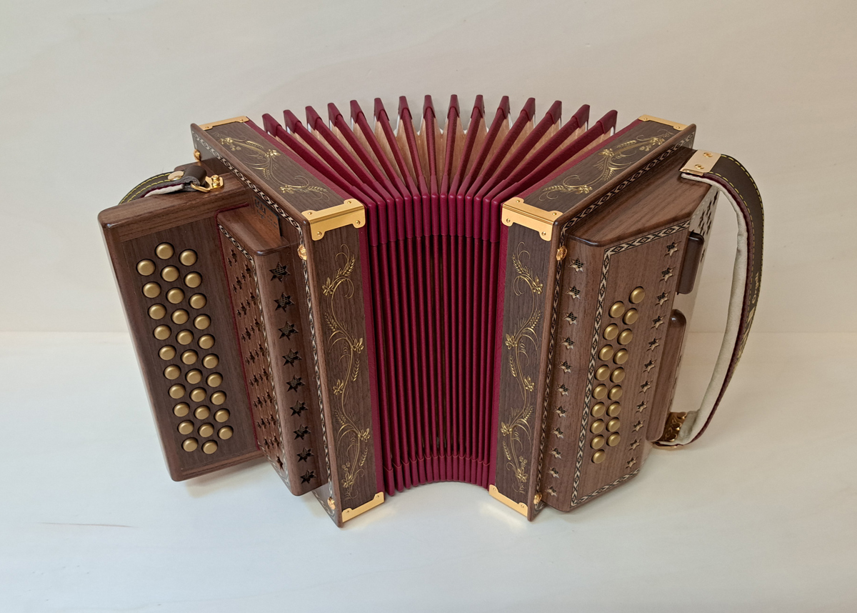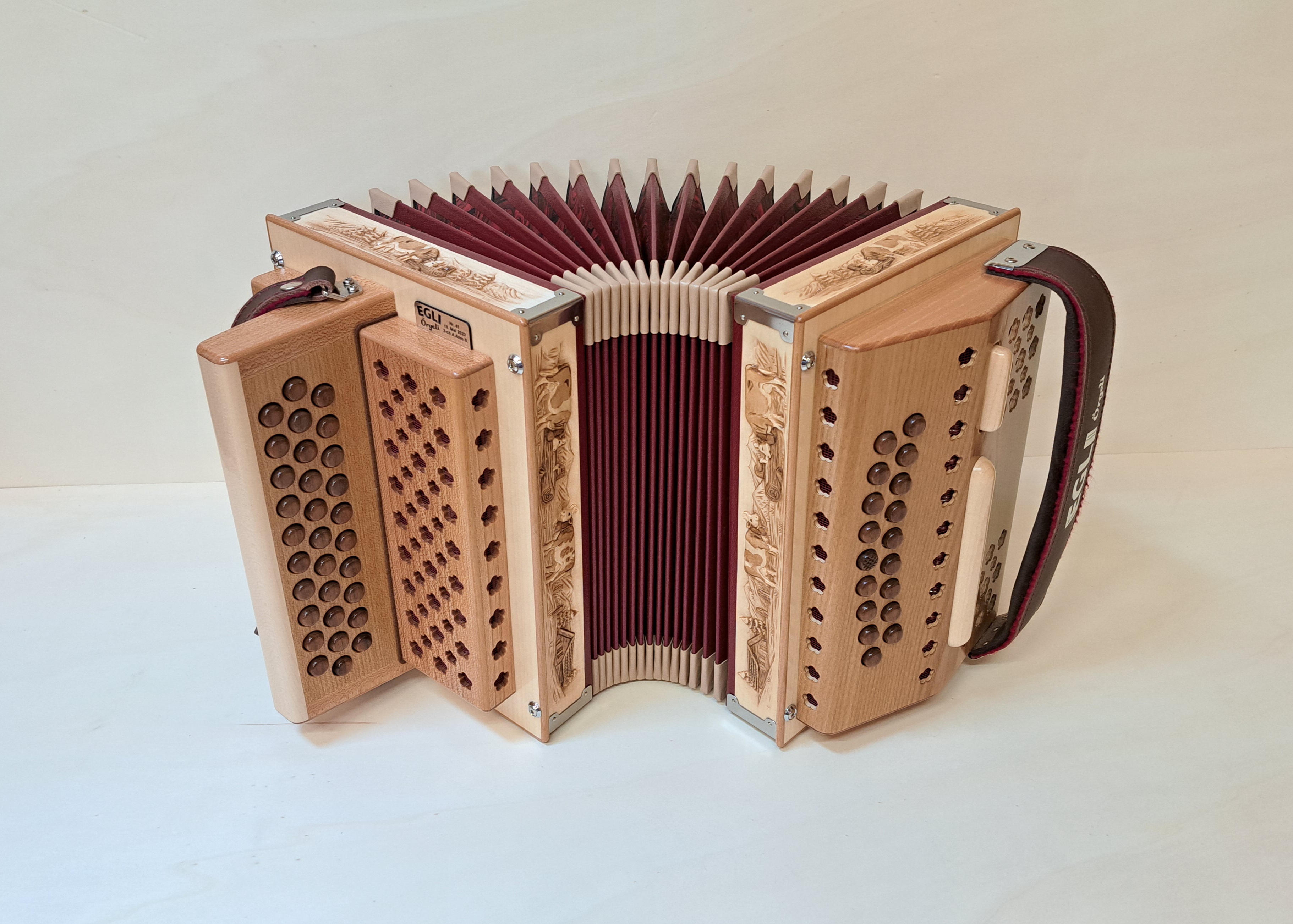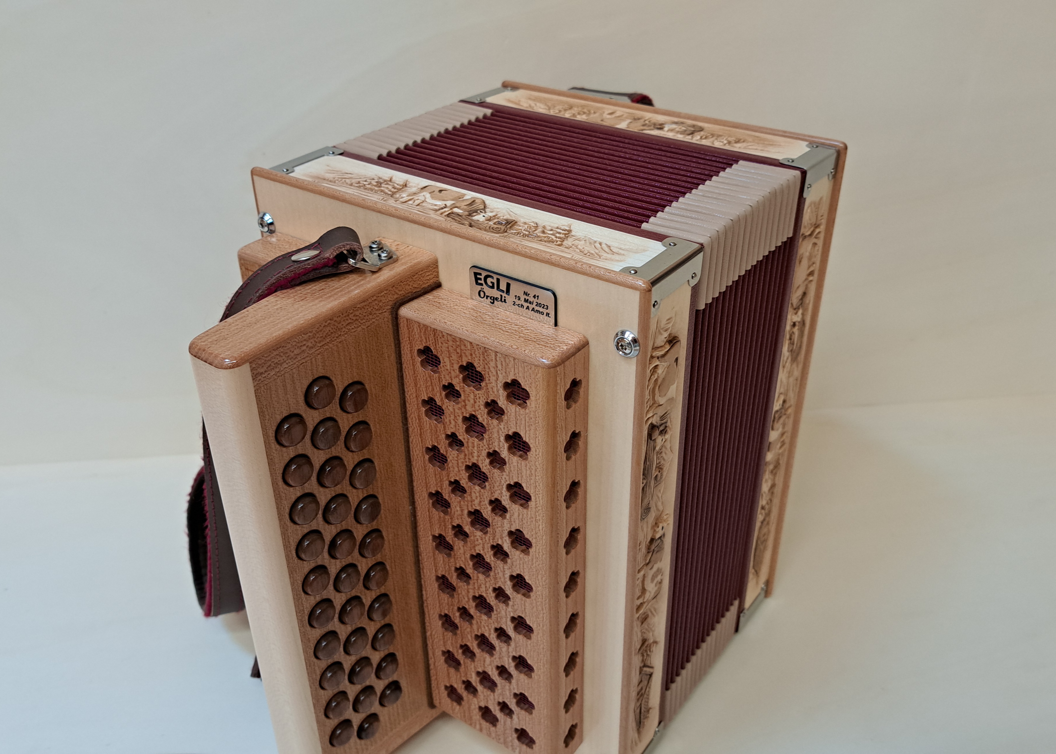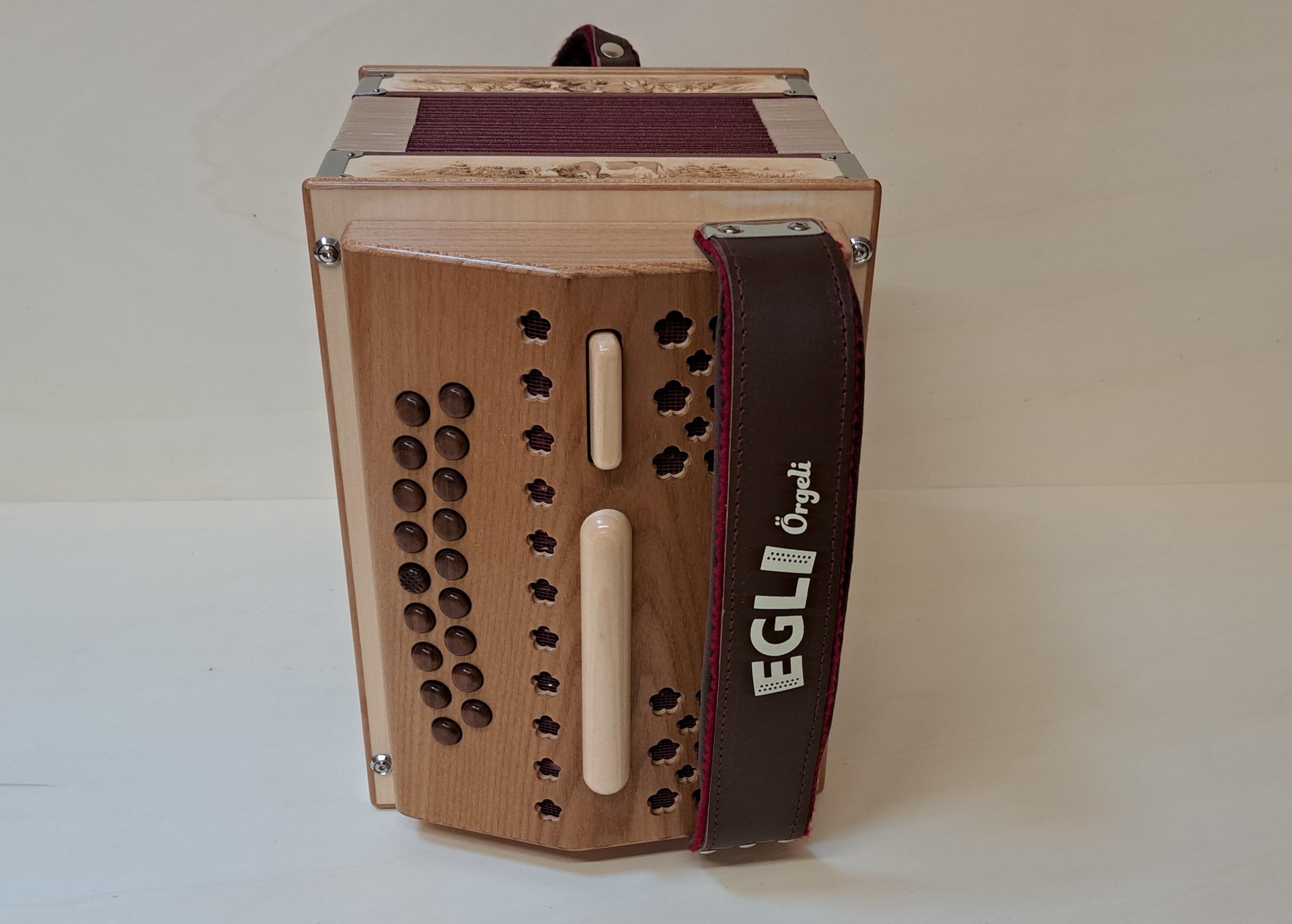 Dieses Örgeli ist in Ahorn und Ulmenholz mit handgeschnitztem Balgrahmen und Nussbaumknöpfen hergestellt.