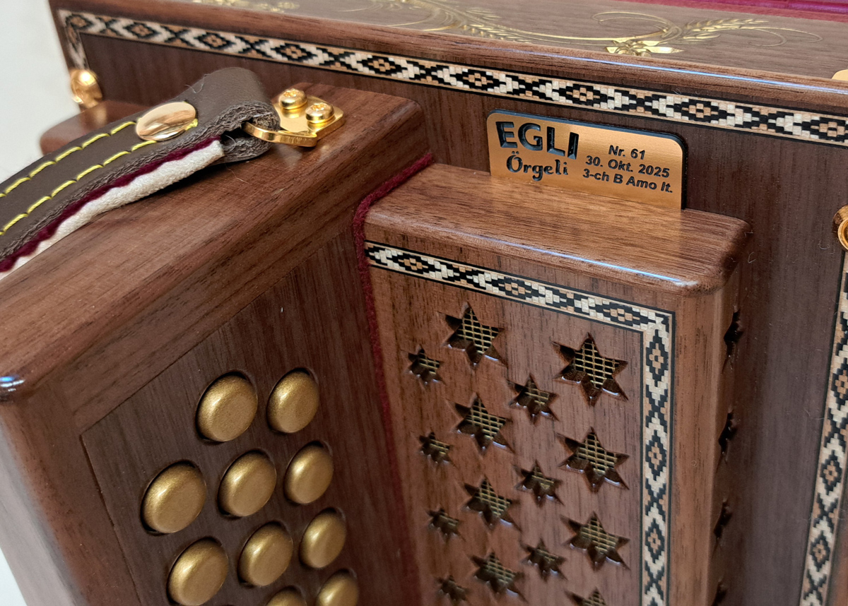 Dieses Örgeli (grosse Ausführung) ist mit Ahorn- und Nussbaumholz gebaut, mit Stimmen von der Firma Binci aus Italien.